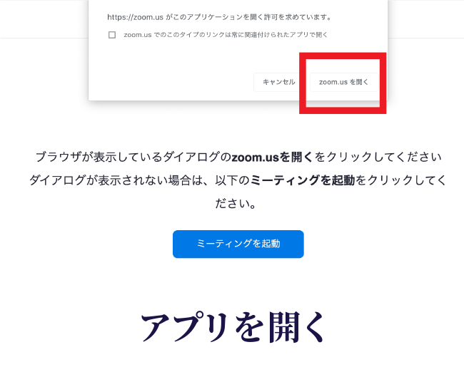 招待URLをクリックすると、Zoomアプリを開く許可を求められるので「Zoom.usを開く」(Mac)または「Zoom Meetingsを開く」(Windows)をクリックしてください。