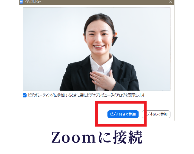 Zoomアプリを起動させたら、「ビデオ付きで参加」をクリックします。