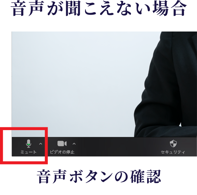 音声が聞こえない場合は、左下のアイコンが「オーディオに参加」になっていないかを確認してください。通話が可能の時は、左下のマイクのアイコンが「ミュート」になっています。※通話ができない状態の時は「ミュート解除」となっています。
